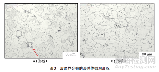 國(guó)家標(biāo)準(zhǔn)GB/T 13299—2022對(duì)游離滲碳體進(jìn)行了規(guī)定,指出游離滲碳體是獨(dú)立于鐵素體基體或晶界的滲碳體,游離滲碳體是碳元素質(zhì)量分?jǐn)?shù)不大于0.15%的低碳鋼經(jīng)退火產(chǎn)生,是珠光體的轉(zhuǎn)變產(chǎn)物。三次滲碳體是極低碳鋼(碳元素質(zhì)量分?jǐn)?shù)小于0.02%)從727℃緩冷至室溫時(shí),從鐵素體中沿晶界析出的滲碳體,其表達(dá)式為Fe3CⅢ,可見(jiàn)三次滲碳體的生成條件主要有兩個(gè),即非常低的碳含量和緩慢的冷卻速率,也可將低碳汽車(chē)板中的三次滲碳體看做游離滲碳體來(lái)進(jìn)行評(píng)定。