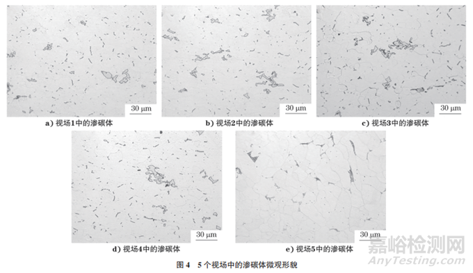 用IAS8金相分析軟件對(duì)圖5中單視場(chǎng)內(nèi)的滲碳體進(jìn)行定量分析,得到視場(chǎng)內(nèi)滲碳體總面積為628μm2,最大滲碳體長(zhǎng)度為15.376μm,寬度為6.90μm,單個(gè)最大滲碳體面積為42.09μm2。