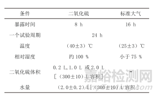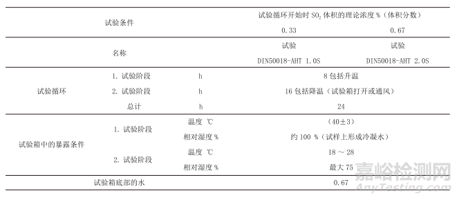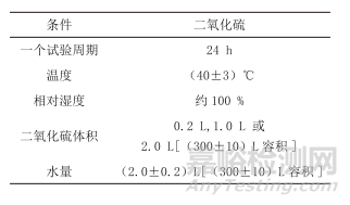 試驗(yàn)條件見表3,引用DIN EN ISO 6988:1997-03標(biāo)準(zhǔn)6.1、6.2和6.4,部分偏離。除非特別規(guī)定,試驗(yàn)周期為1、2、5、10、15或20。若達(dá)到規(guī)定腐蝕程度或試樣外觀或功能損壞到不可接受程度時(shí)試驗(yàn)結(jié)束。