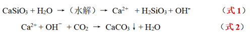 ② 泛堿:基材中通常含有較多堿性物質或鹽類,由于雨水的滲入會遷移至漆膜中間或表面從而破壞漆膜內部結構或改變漆膜顏色,尤其是在堿性的水泥底材上顯得尤為明顯,水泥中的主要成份是硅酸鈣(CaSiO3),它是一種弱酸強堿鹽,在遇水的情況下,硅酸鈣水解呈堿性,其堿性的高低與CaSiO3的含量成正比,化學式如式1所示。在水大量存在的情況下,水便成為流動載體,將大量的Ca2+、OH?通過漆膜的毛孔和裂縫滲透到涂膜表面,與空氣反應形成泛堿,泛堿會造成漆膜顏色的改變和破壞,其化學式如式2所示: