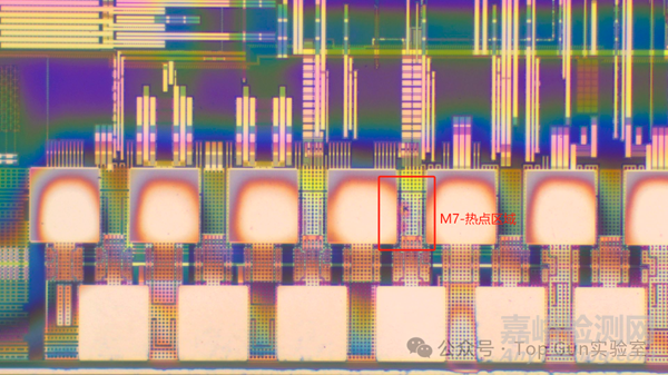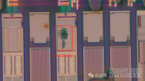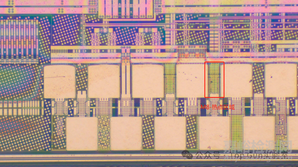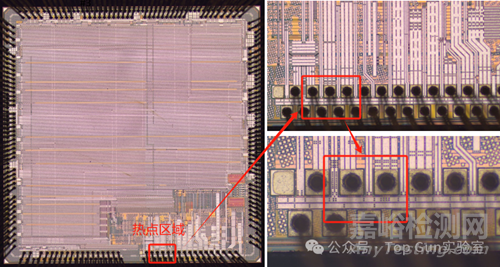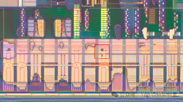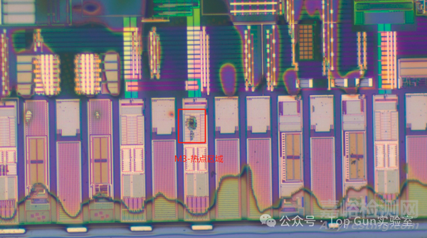 大部分短路失效的樣品開蓋后即可觀察到Burn Mark,但也有一些芯片開蓋后開不到明顯的異常,如下圖短路樣品開蓋后在熱點區(qū)域未發(fā)現(xiàn)明顯異常。