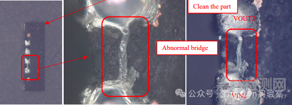 這種外觀檢查能夠快速發(fā)現(xiàn)一些較為明顯的可能導(dǎo)致短路的外部因素。下圖為一個芯片引腳短路的形貌,導(dǎo)致出現(xiàn)這種現(xiàn)象的原因是芯片切割導(dǎo)致的銅絲殘留。