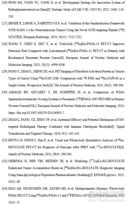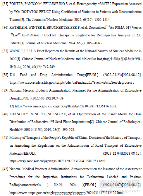 我國1956年開始放射性同位素和核醫(yī)學研究工作[4],經(jīng)過近70年的發(fā)展,取得了長足進步。目前我國批準了35種放藥,但相較于美國批準的59種數(shù)量仍較少,僅2011年至2022年美國食品藥品監(jiān)督管理局批準了18種放藥[5]。我國在核素供應[6]、靶點開發(fā)[7]、藥學研究[8]、檢驗技術[9]、監(jiān)督管理[10]等方面仍有必要開展深入研究。