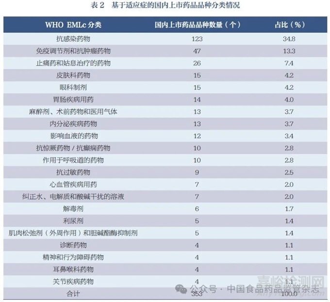 將在我國已上市的353 個品種按適應癥進行分類(表2),發(fā)現(xiàn)已上市品種適應癥較為集中,抗感染藥物品種數(shù)量最多,占比達34.8%。一方面, 這可能與該類藥物品種多、市場大、用量多有關(guān),全球抗感染藥物銷售額約占所有藥品種類總銷售額的15%,位居第2 位[5] ;另一方面,在兒科臨床實際用藥中,由于兒童自身免疫系統(tǒng)尚不成熟,呼吸道感染等容易反復,導致抗感染藥物成為兒童患者最常用藥物種類之一[6-7]。