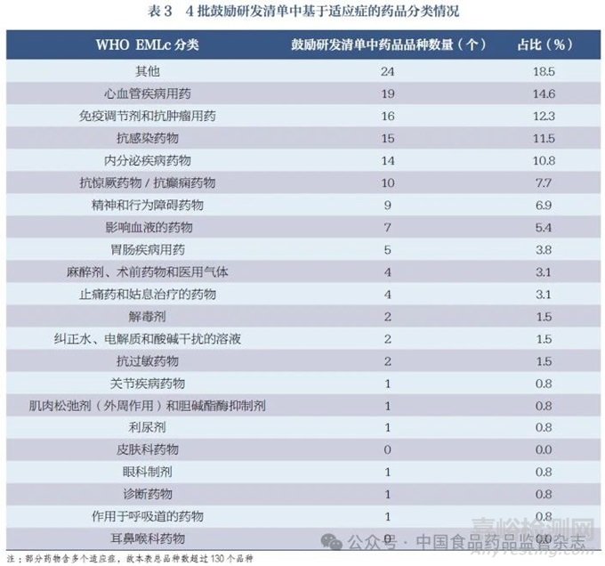 將4 批鼓勵研發(fā)清單中的藥品與第8 版 WHO EMLc 進行對比統(tǒng)計發(fā)現(xiàn),130 個藥品品種中,與第8 版 WHO EMLc 中相同的品種共42 個, 比例為32.3%。鼓勵研發(fā)清單中大部分品種并未收錄在第8 版 WHO EMLc 中,分析其主要原因可能為:①第8 版WHO EMLc 于2021 年發(fā)布,迄今為止已經(jīng)有3 年,在時效性上稍有不足,新上市的罕見病兒童用藥和創(chuàng)新藥并未收錄。② WHOEMLc 收錄的是基于全球兒童疾病情況的安全、有效、經(jīng)濟、可及的藥物,并不直接適用于我國。而鼓勵研發(fā)清單根據(jù)我國兒童臨床需求制定,更符合國內(nèi)兒童用藥現(xiàn)況,但品種數(shù)量相對有限。