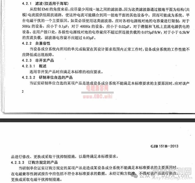 4.2.1 濾波(僅適用于海軍) 從控制 EMI的角度來看,應(yīng)盡量少用線一地之間的濾波器。因為這類濾波器通過接地平面為結(jié)構(gòu)(共模)電流提供低阻抗通路,使這種電流可能耦合到同一接地平面的其他設(shè)備中,因而可能成為系統(tǒng)、平臺電磁干擾的一個主要原因。如果必須使用這類濾波器,應(yīng)對各相電源線對地的電容量進(jìn)行限制:對于50Hz的設(shè)備,應(yīng)小于 0.1uF;對于 400Hz的設(shè)備,應(yīng)小于0.02uf。對于潛艇和飛機(jī)上直流電源供電的設(shè)備,在用戶接口處,各極性電源線對地的電容量應(yīng)不超過所連接負(fù)載的0.075uF/KW;對于小于 0.5kW的直流負(fù)載,濾波器電容量不應(yīng)超過 0.03uF。