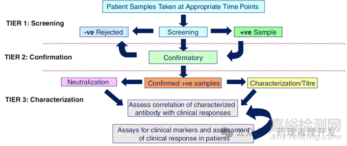 典型的免疫原性三級檢測步驟如下圖所示,先對樣本進行第一級的篩選,之后對篩選陽性的樣本加樣確認,最后對確認陽性的樣本進行滴度檢測和中和活性確認。實際工作中,并不是對所有階段的臨床樣本均進行完整的三級檢測。比如,中和活性檢測通常在關(guān)鍵三期臨床才開展。