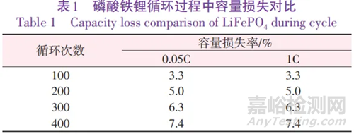 根據(jù)文獻(xiàn)研究,磷酸鐵鋰循環(huán)衰減的主要原因一方面是活性鋰的損失,另一方面是阻抗增加導(dǎo)致極化變大,容量下降較快。當(dāng)測(cè)試電流足夠小時(shí),電池極化很小,可以排除由于極化引起的容量損失。表1對(duì)比了循環(huán)過(guò)程中1C和0.05C測(cè)試的磷酸鐵鋰容量損失情況。從表1看出,容量損失與測(cè)試電流無(wú)關(guān),因而排除了極化帶來(lái)的容量損失,也就是說(shuō)在前期循環(huán)過(guò)程中容量損失來(lái)自于成膜的消耗。