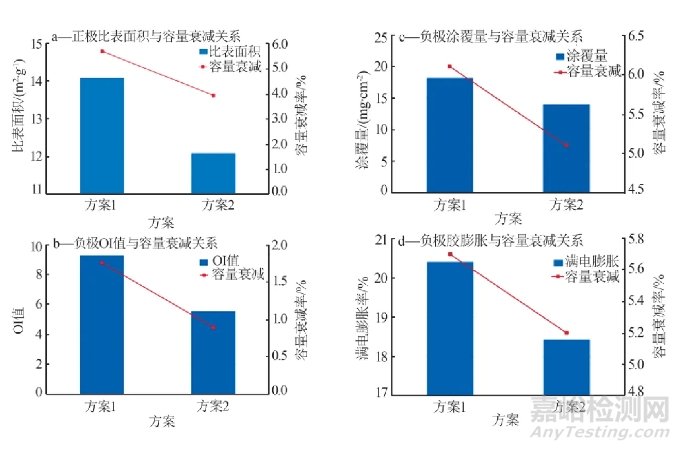 從負(fù)極方面考慮,膨脹大的負(fù)極會(huì)加速SEI膜的破壞與修復(fù),增加活性鋰的消耗。文獻(xiàn)報(bào)道,在充滿電過(guò)程中晶格逐漸膨脹,與此同時(shí)顆粒會(huì)伴隨著發(fā)生結(jié)構(gòu)調(diào)整來(lái)使得自身應(yīng)力得到釋放。負(fù)極材料OI值代表石墨材料的取向系數(shù),是表征石墨負(fù)極在嵌鋰過(guò)程中膨脹率的一項(xiàng)重要指標(biāo)。石墨材料OI值大,說(shuō)明在充滿電過(guò)程中晶格膨脹大,導(dǎo)致負(fù)極體系膨脹大,加速SEI膜消耗。圖4b為負(fù)極OI值與容量衰減率的關(guān)系。其中:方案1為負(fù)極OI值較大的方案;方案2為負(fù)極OI值較小的方案。從圖4b看出,當(dāng)OI值范圍為5~10時(shí),OI值增加65%,極片反彈率增加4.1%,容量衰減率增加0.9%。圖4c為負(fù)極涂覆量與容量衰減率的關(guān)系。其中:方案1為負(fù)極涂覆量較高的方案;方案2為負(fù)極涂覆量較低的方案。從圖4c看出,涂覆量增加30%,極片反彈率增加9%,容量衰減率增加1.0%。圖4d為負(fù)極膠膨脹率與容量衰減率的關(guān)系。其中:方案1為負(fù)極膠膨脹較高的方案;方案2為負(fù)極膠膨脹較低的方案。從圖4d看出,膠膜反彈率增加20%,極片反彈率增加2%,容量衰減率增加0.5%。OI值、涂覆量、膠膜膨脹增大,導(dǎo)致極片的反彈增加,而負(fù)極膨脹對(duì)SEI膜的破壞性增加,導(dǎo)致活性鋰消耗增加,容量衰減加速。