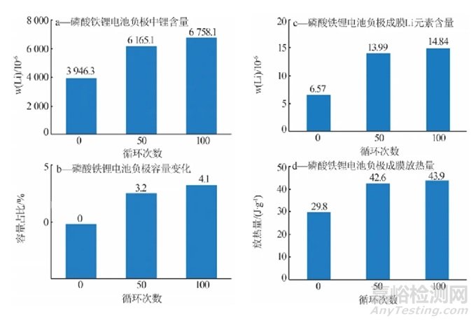 通過(guò)實(shí)驗(yàn)手段對(duì)上述理論進(jìn)行驗(yàn)證。圖2a為通過(guò)ICP測(cè)試的新鮮電池、循環(huán)50次、循環(huán)100次兩種電芯負(fù)極片中的鋰含量。從圖2a看出,在各個(gè)階段負(fù)極片中的鋰含量均是三元電池高于磷酸鐵鋰電池。