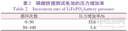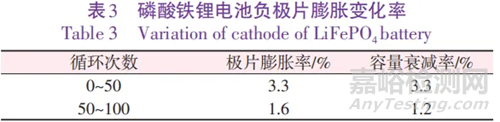 表3為負(fù)極片膨脹變化率。通過(guò)表3中拆解電池的極片膨脹率可知,前50次極片膨脹率為3.3%,相應(yīng)的容量衰減率為3.3%,50~100次的極片膨脹率為1.6%,相應(yīng)的容量衰減率為1.2%,極片膨脹與容量衰減是相對(duì)應(yīng)的。因而磷酸鐵鋰前期衰減快的原因主要是負(fù)極體系膨脹導(dǎo)致SEI膜破壞,而破壞的SEI 膜重新修復(fù)會(huì)消耗活性鋰,因而導(dǎo)致容量衰減快。