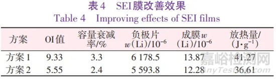 針對(duì)上述提到的改善因素,從分析SEI膜穩(wěn)定性方面進(jìn)行驗(yàn)證。表4為SEI膜改善效果。從表4看出,以負(fù)極OI值為例,當(dāng)負(fù)極材料OI值從9.33降低至5.55時(shí),循環(huán)100次后容量衰減從3.3%降低至2.4%,ICP測(cè)試負(fù)極片中鋰質(zhì)量分?jǐn)?shù)由6.1785×10-3降低至5.593 8×10-5,EDS測(cè)試負(fù)極片表面SEI膜Li元素質(zhì)量分?jǐn)?shù)由1.387×10-5降低至1.228×10-5,DSC測(cè)試負(fù)極片放熱量由41.27J/g降低至 36.61J/g,證實(shí)了改善循環(huán)的可行性。