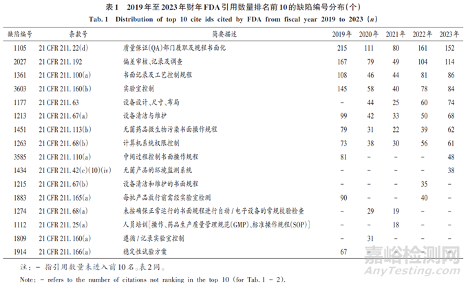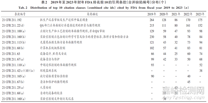 FDA對21 CFR & 211中的條款進行拆分、細化、標準化引用,針對不同缺陷內(nèi)容形成了唯一的內(nèi)部缺陷編號。2019年至2023年財年,F(xiàn)DA分別引用了384個、286個、235個、283個、328個缺陷編號。引用數(shù)量排名前10的缺陷編號見表1。