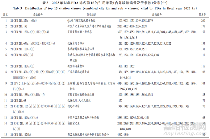 FDA 211條款中,同一條款可對應多個子條款或多個缺陷編號,不同條款及不同缺陷編號對應不同情況,針對不同缺陷編號進行合并統(tǒng)計,2019年至2023年財年排名前10的引用條款見表2;根據(jù)不同缺陷編號及子條款進行合并,2023年財年排名前15的引用條款見表3。對比分析表1和表2引用條款發(fā)現(xiàn),前4名缺陷條款編號基本一致,僅21 CFR 211. 192 及21 CFR 211. 22(d)順序發(fā)生了改變。21 CFR 211. 110(a)(除2019年外)及21 CFR 211. 42(c)(10)(iv)均為新列入2023年財年引用排名前10的條款。以下針對引用條款排名前5及新列入2023年的條款進行分析。