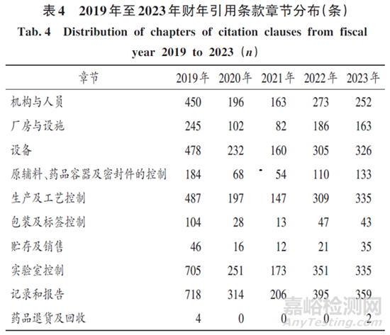 FDA的GMP共11個章節(jié),按缺陷引用條款章節(jié)對2019年至2023年財年的數(shù)據(jù)進行分析發(fā)現(xiàn),實驗室控制、記錄和報告2 個章節(jié)為引用條款數(shù)最多的章節(jié)。2023年的記錄和報告、實驗室控制、生產(chǎn)及工藝控制、設備、機構(gòu)與人員條款的分布較均勻,廠房與設施,原輔料、藥品容器及密封件的控制,包裝及標簽控制、貯存及銷售的引用條款相對較少,藥品退貨及回收的引用條款最少。詳見表4。