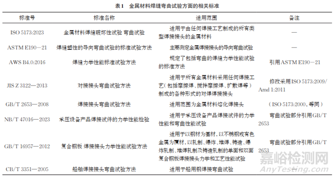 21世紀以來,為適應焊接新技術、新工藝、新材料的發(fā)展,作為工藝性能評價的焊接彎曲試驗方法標準也發(fā)生了較大變化,其中最重要的國際標準ISO 5173:2000 就歷經(jīng)了ISO 5173:2009、ISO 5173:2009/Amd 1:2011、ISO 5173:2023等多次版本更新,其他國內外主要焊接彎曲試驗方法標準如ASTM E190-21、AWS B4.0:2016、JIS Z 3122-2013、NB/T 47016—2023、GB/T 16957—2012 和CB/T 3351—2005也都進行了更新(見表1)。因此,GB/T 2653—2008已很難適應新的形勢而亟需修訂。筆者結合最新ISO 5173:2023標準及國內外焊縫彎曲試驗標準,對GB/T 2653—2008的修訂提出了建議。