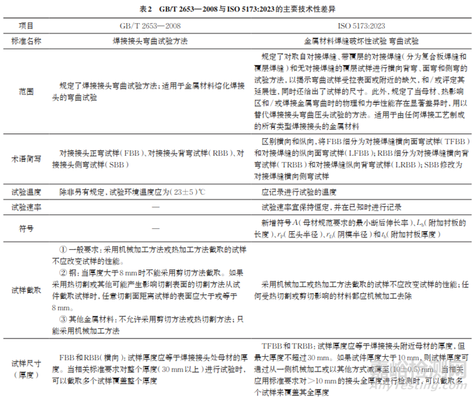 GB/T 2653—2008系等同采用ISO 5173:2000,由于ISO 5173:2000到ISO 5173:2023已經(jīng)過多次版本修訂,因此,GB/T 2653—2008與ISO 5173:2023標準對比已有較大不同,特別在標準的適用范圍、彎曲試樣的類型和尺寸、彎曲試驗過程中的技術條款等方面差別較大(見表2)。