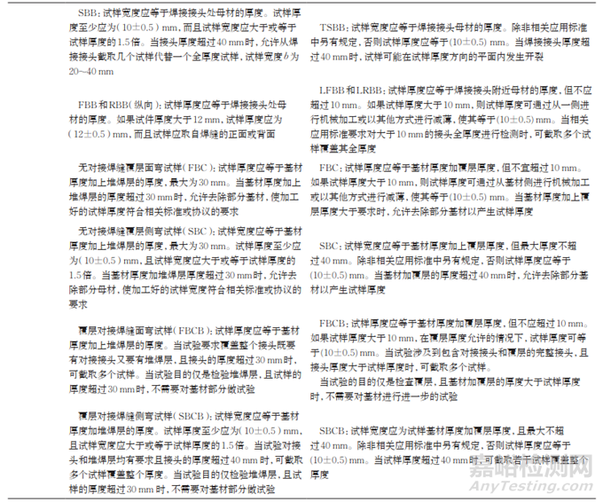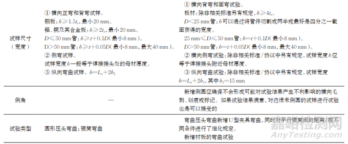 從表3可看出,國內外金屬材料彎曲試驗標準中除ASTM標準外均規(guī)定“產(chǎn)品標準未規(guī)定時,彎曲外表面無目視可見裂紋應評定為合格”,當然,這一要求對金屬焊縫過于苛刻,故ISO 5173:2000標準中給出了“除非另有規(guī)定,在試樣表面上小于3mm長的缺欠應判為合格”的要求。ISO 5173:2009標準取消了這一要求,這是因為國際焊接標準化技術委員會(ISO/TC 44)已將焊縫彎曲合格判定要求歸入了焊接工藝評定、焊工技能評定和相關產(chǎn)品標準中。如ISO 15614-1:2017《金屬材料焊接工藝評定試驗 第1部分:鋼電弧焊和氣焊以及鎳及鎳合金的電弧焊》(對應GB/T 19869.1-2005《鋼、鎳及鎳合金的焊接工藝評定試驗》)、ISO 9606-1:2012《焊工技能評定 熔化焊 第1部分:鋼》(對應GB/T 15169—2003《鋼熔化焊焊工技能評定》)、ISO 9606-5:2000《焊工技能評定 熔化焊 第5部分:鈦及鈦合金、鋯及鋯合金》(對應GB T 36234—2018《鈦及鈦合金、鋯及鋯合金熔化焊焊工技能評定》)等均規(guī)定“試樣任何方向不得出現(xiàn)大于3mm長的缺欠”。由于GB/T 2653—2008是采標ISO 5173:2000制定且一直未修訂,故成了唯一保留合格判定的金屬焊縫彎曲試驗標準,須在標準修訂中完善。