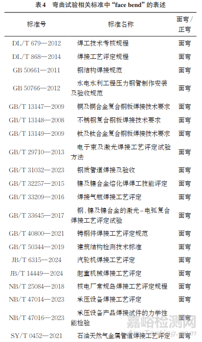 目前“face bend”的翻譯有面彎和正彎兩種,據(jù)不完全統(tǒng)計,現(xiàn)行彎曲相關標準中面彎占多數(shù)(見表4),中國焊接協(xié)會發(fā)布的團標T/CWAN 0010—2018《焊接術語 焊接檢驗》給出了術語“面彎試驗”(face bend test)的定義為:“使焊接接頭上表面受拉的彎曲試驗,亦稱正彎試驗(試樣受拉面為焊縫正面)”,因此,建議GB/T 2653—2008修訂時將“正彎”修改為“面彎”,與其他現(xiàn)行大多數(shù)標準保持一致。