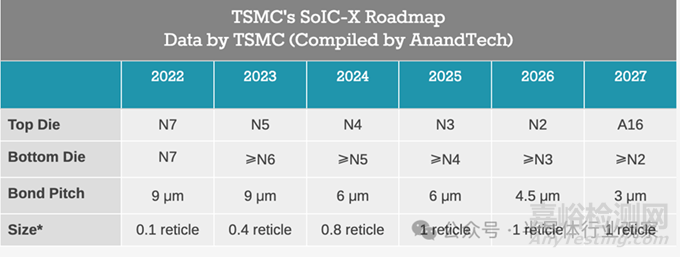 但如果一切按照臺積電的計劃進行,這些限制預計很快就會消失。SoIC-X 技術將快速發(fā)展,到 2027 年,將有可能組裝一個芯片,將臺積電尖端 A16(1.6 納米級)上制造的掩模版大小的頂部芯片與使用臺積電 N2(2 納米級)生產(chǎn)的底部芯片配對。這些芯片將依次使用 3μm 鍵合間距硅通孔 (TSV) 連接,密度是當今 9μm 間距的三倍。如此小的互連將允許總體上更大的連接數(shù)量,從而大大提高組裝芯片的帶寬密度(從而提高性能)。
