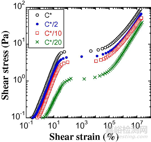 圖4 不同HPMC濃度(低于C*)下穩(wěn)定的石蠟油乳液的應力-應變曲線掃描曲線