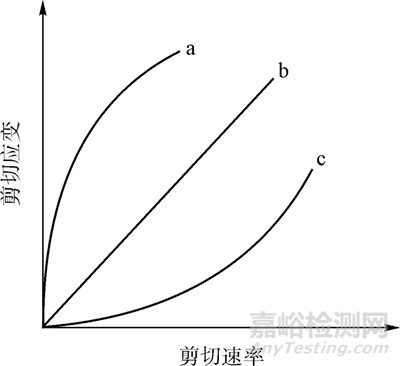圖1 假塑性流體(a)、牛頓流體(b)和脹塑性流體(c)的流變曲線