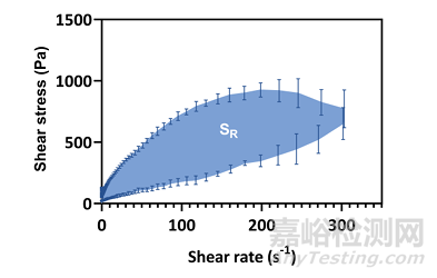 觸變環(huán)可表征觸變性:當剪切速率從0連續(xù)增加到一個定值,再從這個定值逐漸下降到0,測定其應力隨剪切速率的變化,剪切應力-剪切速率的封閉曲線為觸變環(huán)。觸變環(huán)的面積越大則觸變性越大,反之則越小。在0.01至300 s-1的剪切速率范圍內(nèi)的觸變環(huán),如圖7。