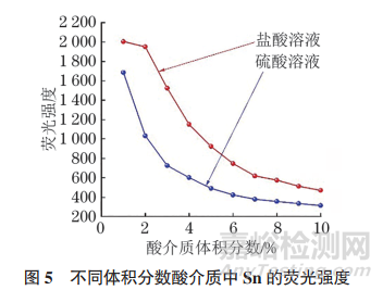 采用原子熒光光譜法測(cè)定時(shí),地質(zhì)樣品中Sn發(fā)生氫化反應(yīng)所需的酸度范圍較窄,因此上機(jī)溶液中的酸介質(zhì)及其體積分?jǐn)?shù)對(duì)氫化物產(chǎn)出效率影響較大。以10.00µg·L−1Sn標(biāo)準(zhǔn)溶液為分析液,以常見鹽酸、硫酸溶液作為其酸介質(zhì),比較了酸介質(zhì)的體積分?jǐn)?shù)在1%~10%內(nèi)變化時(shí)的Sn熒光強(qiáng)度,結(jié)果見圖5。