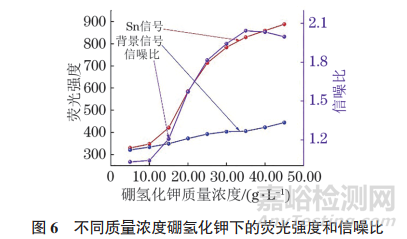 結(jié)果顯示:背景和Sn的熒光強(qiáng)度都隨著硼氫化鉀的質(zhì)量濃度的升高而增大,當(dāng)硼氫化鉀的質(zhì)量濃度大于 25.00 g·L−1時(shí),Sn熒光強(qiáng)度增長(zhǎng)放緩,且信噪比在硼氫化鉀的質(zhì)量濃度為35.00 g·L−1時(shí)最大。考慮到硼氫化鉀質(zhì)量濃度為30.00~45.00g·L−1 時(shí)信噪比變化非常有限,試驗(yàn)選擇的硼氫化鉀質(zhì)量濃度為30.00g·L−1。