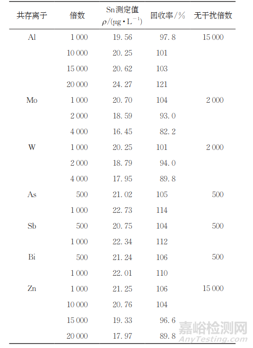 巖石、土壤和水系沉積物等地質(zhì)樣品基體異常復(fù)雜,含有不同的微量元素和伴生元素,常見的有Fe、Mn、Cu、Pb、Ni、Tl、Ca、Mg、Zn、Al、Mo、W、As、Sb、Bi、Hg、Cr、S、C、Si、Li、Be、Ta、Ag、Co、Au、K、Na元素和稀土元素等。原子熒光光譜法多采用溶劑萃取、離子交換、共沉淀或堿性體系等來(lái)消除或抑制共存離子干擾。本方法采用過(guò)氧化鈉高溫熔融樣品,高溫條件下S、C、Hg等易被氧化成氣體分離;用乙醇和熱水浸取,能使在堿性條件下易沉淀的元素分離,包括Fe、Cu、Mn、Ni、Tl、Ca、Mg、Co元素;以硫脲和抗壞血酸作為掩蔽劑和還原劑,可以有效地抑制和消除Si、Au、Ag、Cr、Pb等共存元素的離子干擾;堿金屬、堿土金屬和稀土元素不與硼氫化鉀發(fā)生氫化反應(yīng),對(duì)Sn測(cè)定無(wú)干擾。針對(duì)Al、Mo、W、As、Sb、Bi、Zn等其他7種共存元素,以20.00µg·L−1Sn 標(biāo)準(zhǔn)溶液為分析液,考察了不同倍數(shù) (相對(duì)于20.00µg·L−1Sn)下這7種共存元素對(duì) Sn 測(cè)定的干擾,結(jié)果見表1。當(dāng)Sn的回收率在(90.0%,110%] 內(nèi)時(shí),視為該倍數(shù)的共存元素對(duì)Sn的測(cè)定無(wú)干擾。