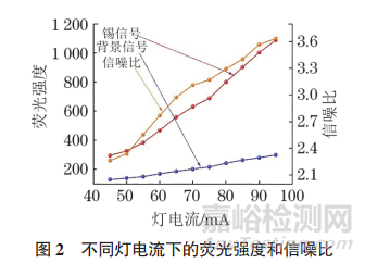 結(jié)果顯示,背景和Sn的熒光強(qiáng)度都隨著燈電流的增加而增加,在燈電流不小于80mA時(shí)信噪比增加趨勢(shì)變緩。考慮到燈電流過(guò)大可能影響元素?zé)舻氖褂脡勖?,試?yàn)選擇的燈電流為 80mA。