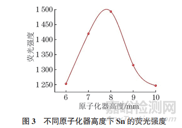 結(jié)果顯示,當(dāng)原子化器高度為8mm時(shí),Sn的熒光強(qiáng)度最大,原子化效率最高,因此試驗(yàn)選擇的原子化器高度為8mm。
