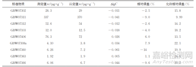 按照試驗(yàn)方法分析9個(gè)國(guó)家一級(jí)標(biāo)準(zhǔn)物質(zhì),參考DZ/T 0130— 2006《地質(zhì)礦產(chǎn)實(shí)驗(yàn)室測(cè)試質(zhì)量管理規(guī)范》計(jì)算測(cè)定值與認(rèn)定值的對(duì)數(shù)差(?lgC)以及允許相對(duì)誤差,結(jié)果見表2。