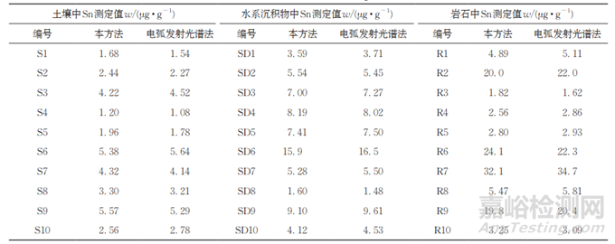 為了進(jìn)一步驗(yàn)證本方法的可靠性,分別采用本方法和電弧發(fā)射光譜法測(cè)定10份土壤(編號(hào)為Sl~S10)、10份水系沉積物(編號(hào)為SDl~SD10)、10份巖石(編號(hào)為 Rl~R10)樣品中Sn的含量,結(jié)果見表3。