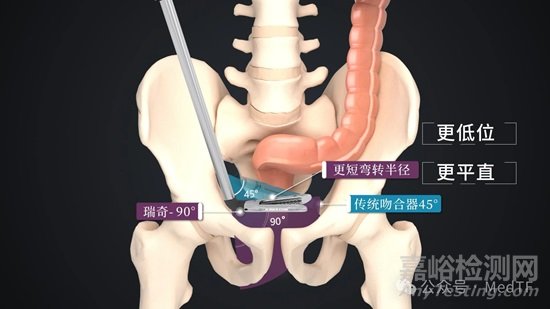 “睿志”是一款超大彎轉角度(90°)智能電動腔鏡吻合器,其最大特點在于90°超大彎轉角度。90°超大彎轉角度出現(xiàn)解決很多臨床問題,以低位直腸癌的手術為例。