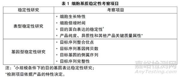 1、傳代培養(yǎng)過程中的穩(wěn)定性研究包含表型穩(wěn)定性研究和基因型穩(wěn)定性研究。具體考察項目見表1所示。表型穩(wěn)定性研究主要考察細胞基質(zhì)傳代過程中細胞倍增時間和產(chǎn)品質(zhì)量的穩(wěn)定性,基因型穩(wěn)定性考察細胞基質(zhì)在傳代培養(yǎng)過程中重組DNA整合位點、拷貝數(shù)和目標(biāo)序列等基因水平上的穩(wěn)定性因素。建立主細胞庫時,應(yīng)同步考察其表型穩(wěn)定性和基因型穩(wěn)定性,以確定細胞庫的傳代次數(shù)限度,支持生產(chǎn)工藝的需求。建立工作細胞庫后,應(yīng)考察工作細胞庫的表型穩(wěn)定性和基因型穩(wěn)定性特征,確定工作細胞庫的傳代次數(shù)要求。