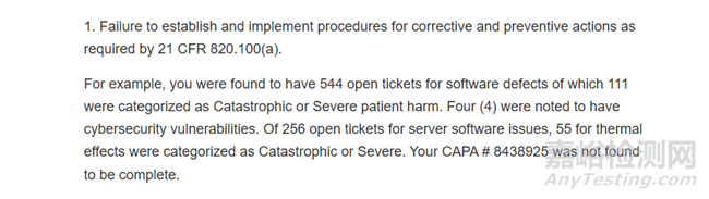 此封警告信的簽發(fā)日期為11月22日,并于12月17日正式對外公布。警告內容主要涉及今年5月份對位于圣地亞哥的前CareFusion生產設施進行的一次深入檢查。檢查結果顯示,該設施在質量管理體系方面存在明顯不足,未能有效遵守關于問題報告以及產品更正與召回的相關法規(guī)要求。警告信中明確提到了高達544個尚未解決的軟件缺陷工單,其中更有111個被嚴重程度分級為對患者災難性或嚴重性傷害級別。