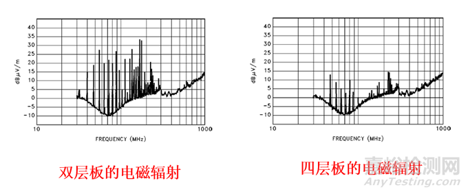 圖1中,左圖是電路布置在兩層PCB上的輻射情況,右圖是電路布置在四層板上(其中兩層分別是地線面和電源面)的輻射情況,可以看到,四層板的輻射遠低于兩層板的輻射。