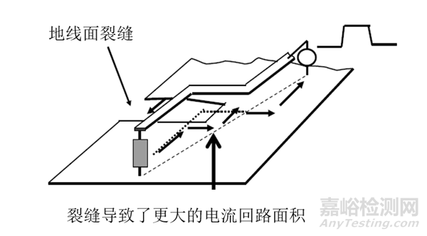 圖2 PCB地線面上裂縫改變了地線電流的路徑