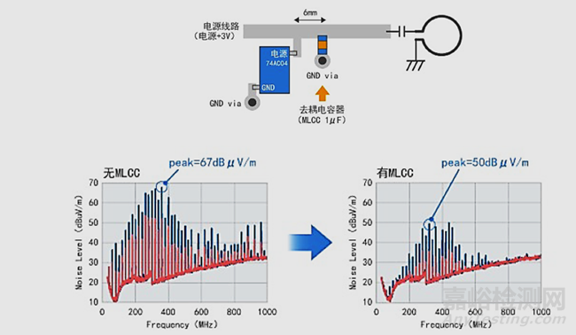 以上從解除數字電路與模擬電路之間的干擾耦合角度了解了去耦電容的用途。實際上,這個電容對降低輻射的效果也是十分重要的,圖3是去耦電容對于降低輻射的效果。