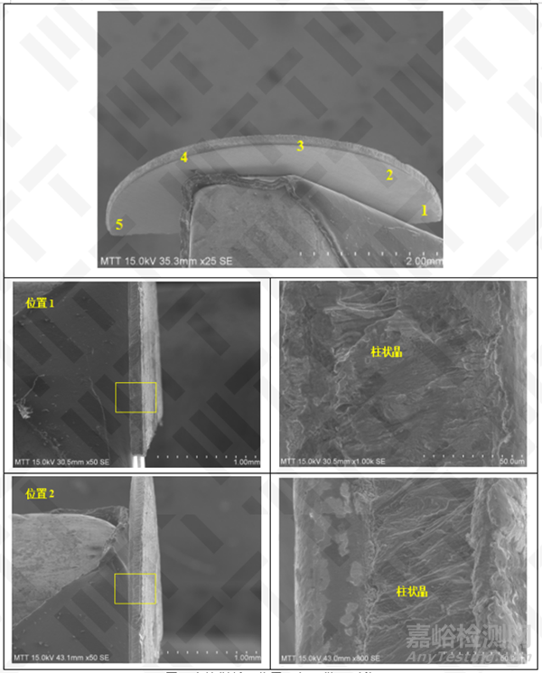 由圖2可知,在斷口位置1與2發(fā)現(xiàn)斷面厚度方向均為凝固時原始的柱狀形貌,裂紋沿柱狀晶面擴(kuò)展,晶界結(jié)合強度較差,基本無晶界撕裂形貌,該形貌表明該位置的焊接強度低。斷口未見明顯腐蝕與損傷。