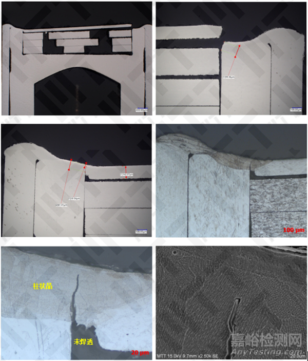 2、失效件顯微組織中晶粒為平行厚度方向的柱狀晶,且搭接根部存在未焊透現(xiàn)象。組織上的強度薄弱以及結(jié)構(gòu)上存在應(yīng)力集中,導(dǎo)致斷裂發(fā)生于此處。