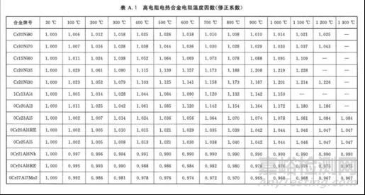 在元件使用的高電阻合金材料已知的情況下,通過查GB/T 1234-2012《高電阻電熱合金》中的《高電阻電熱合金電阻溫度因素(修正系數(shù))》表,可以推算工作溫度T。