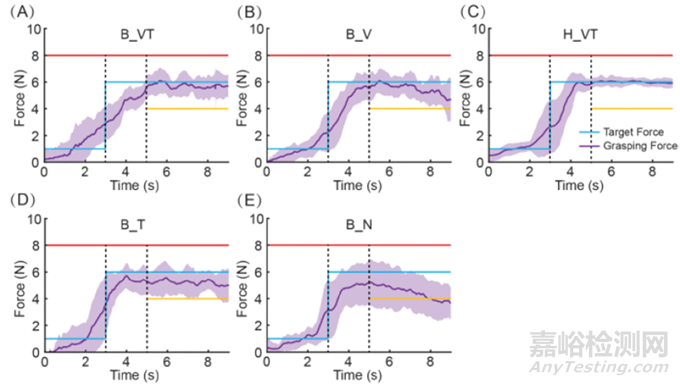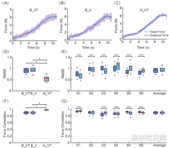 通過比較不同反饋條件下的力量跟蹤誤差(RMSE)、成功率和力量相關性,研究發(fā)現(xiàn)視覺反饋是抓握力量控制中的重要因素,特別是在缺乏視覺反饋的情況下,觸覺反饋能夠有效提高運動表現(xiàn)。這驗證了仿生手虛擬平臺作為訓練截肢者的有效性,同時表明觸覺反饋可以在缺乏視覺信息時作為可靠的替代反饋源。