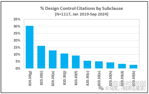如下圖1所示,在2019年1月至2024年9月期間結(jié)束的檢查中,F(xiàn)DA共向醫(yī)療器械制造商發(fā)出了1117條意見。按百分比計算,設(shè)計驗(yàn)證、設(shè)計變更、一般控制、設(shè)計歷史檔案和設(shè)計驗(yàn)證方面的缺陷占這些檢查意見的近80%。