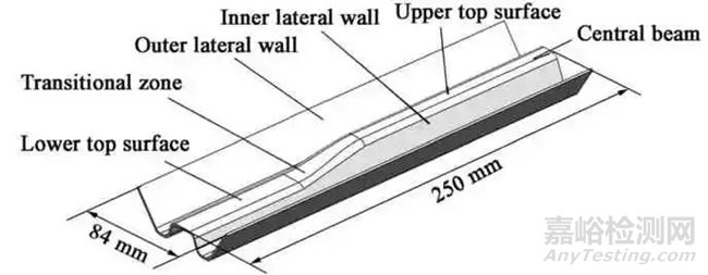 目標(biāo)零件為W 型汽車(chē)防撞梁特征件,三維模型和尺寸如圖2 所示,該零件截面呈W 型,主要分為中梁、外側(cè)壁和內(nèi)側(cè)壁3 部分,并且在寬度方向沿中心面左右對(duì)稱(chēng)。中梁的上頂面和下頂面通過(guò)過(guò)渡區(qū)連接,過(guò)渡區(qū)、內(nèi)側(cè)壁和上頂面的交界處具有小圓角特征,圓弧半徑為3 mm,在常溫下沖壓時(shí)該區(qū)域容易發(fā)生開(kāi)裂。