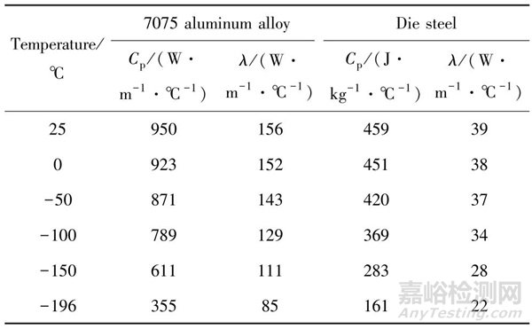 表1 7075 鋁合金和模具鋼的熱物性參數(shù)[8]
