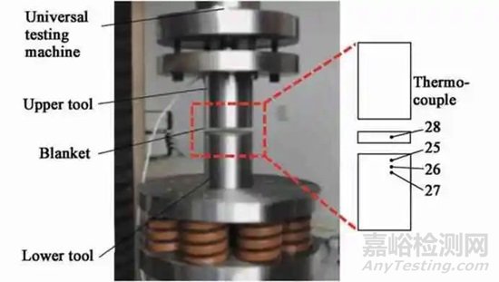 基于超低溫沖壓工況,在Zwick 電子萬(wàn)能試驗(yàn)機(jī)上搭建了超低溫界面熱傳導(dǎo)系數(shù)測(cè)試裝置,如圖6 所示,主要包括上、下圓臺(tái)模具、半徑為35 mm的圓片試樣、液氮容器、4 個(gè)直徑為Φ1 mm 的探針式T 型熱電偶、KEITHLEY7708 數(shù)據(jù)采集器和后處理電腦。設(shè)計(jì)圓臺(tái)實(shí)驗(yàn)?zāi)>呤篃崃恐饕剌S向傳遞,盡可能滿(mǎn)足一維熱傳導(dǎo)假設(shè)。圓片試樣側(cè)面開(kāi)有直徑為Φ1 mm,深度為15 mm 的盲孔,用于固定熱電偶,對(duì)于薄板而言,板料厚向上的溫度梯度可以忽略,即認(rèn)為熱電偶測(cè)試的溫度為板料表面溫度。在下模具內(nèi)部距離上表面2、6 和10 mm 位置處分別安裝3 個(gè)熱電偶。實(shí)際測(cè)試時(shí),先將圓片試樣在液氮容器中浸泡15 min,然后快速轉(zhuǎn)運(yùn)到下圓臺(tái)模具,同時(shí)啟動(dòng)試驗(yàn)機(jī)通過(guò)上夾頭帶動(dòng)上圓臺(tái)模具以20 mm·s-1 的速度下行,達(dá)到設(shè)定壓力時(shí)停止并保壓,在板料溫度恢復(fù)至室溫后取下板料,完成測(cè)試。通過(guò)數(shù)據(jù)采集器記錄模具和板料對(duì)應(yīng)位置的溫度變化歷史,數(shù)據(jù)點(diǎn)分別為25、26、27 和28。實(shí)驗(yàn)中,設(shè)置界面壓力分別為0.5、5 和10 kN。