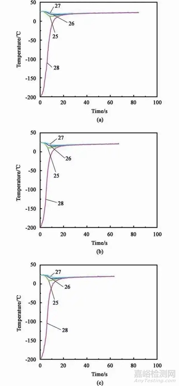 根據(jù)施加載荷和接觸面積的比值計(jì)算得到接觸壓力分別為0.13、1.3 和2.6 MPa,不同接觸壓力下板料和模具溫度變化歷史如圖9 所示,板料轉(zhuǎn)運(yùn)到模具后,模具溫度開(kāi)始下降,板料溫度從-196 ℃上升到約為-170 ℃。在圓臺(tái)模具對(duì)板料施加壓力后,板料的溫度呈快速上升趨勢(shì),表明存在接觸壓力時(shí)板料和模具以極快的速度進(jìn)行熱交換。當(dāng)板料溫度到接近0 ℃時(shí)上升速度明顯減緩,模具上最靠近表面的25 號(hào)測(cè)點(diǎn)從室溫降低到8 ℃,而距離表面更遠(yuǎn)的26、27 號(hào)測(cè)點(diǎn)的最低溫度分別為14 和17 ℃。在上模具壓住板料約20 s 后,所有測(cè)點(diǎn)的溫度都穩(wěn)定在20 ℃左右。對(duì)比不同載荷下的結(jié)果,各個(gè)測(cè)點(diǎn)溫度都具有相同的變化趨勢(shì)。