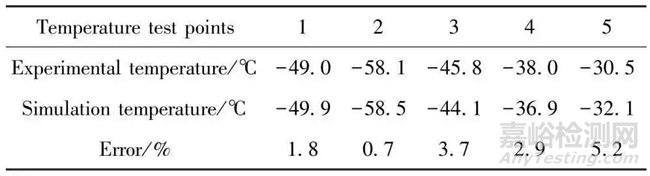 在進(jìn)行液氮制冷后模具的溫度場(chǎng)分布如圖11 所示。從圖中可知,下模具的表面溫度呈梯度分布,中部溫度低,兩邊溫度高,從液氮入口到出口的溫度逐漸升高,在靠近液氮入口處溫度最低,為-58.9 ℃ (箭頭所示),出口處溫度約為-30.4 ℃。自增壓液氮罐向模具輸送的實(shí)際是液氮和空氣的混合物質(zhì),由于液氮輸送管頭部插入模具流道入口,輸送的液氮與測(cè)點(diǎn)2 附近的流道最先接觸,使該位置附近溫度最低。隨后,液氮與模具之間的熱交換使冷卻介質(zhì)中液氮占比逐漸降低,因而靠近入口溫度低、出口溫度高。模具表面溫度的測(cè)試與仿真結(jié)果對(duì)比如表2 所示,5 個(gè)測(cè)溫點(diǎn)的仿真溫度與實(shí)驗(yàn)測(cè)試溫度都較為接近,最大誤差為5.2%,驗(yàn)證了模具溫度場(chǎng)仿真結(jié)果的可靠性。